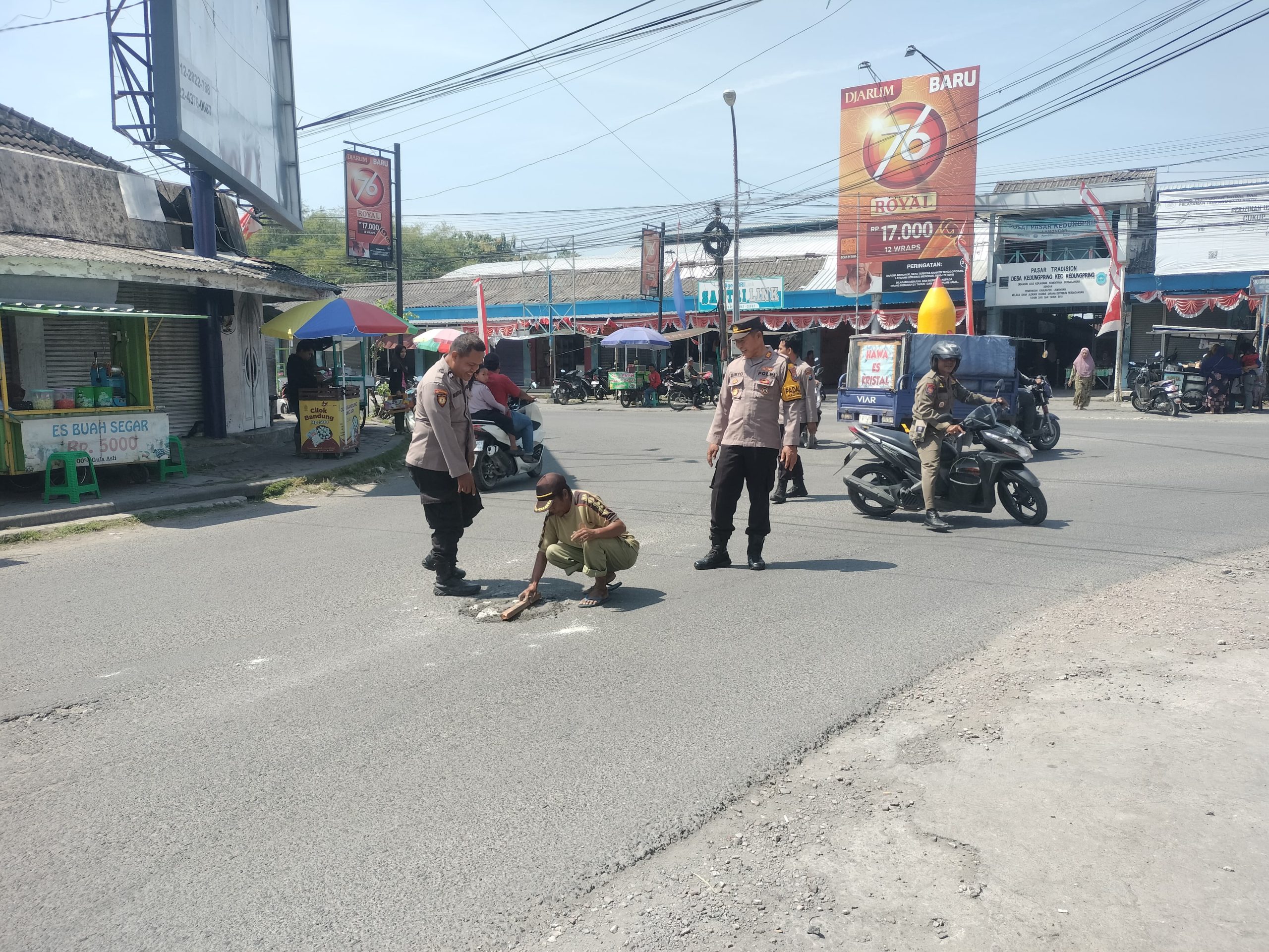 Kapolsek kedungpring AKP Sudibyo, S. H., bersama anggota polsek kedungpring melaksanakan giat pengamanan dalam rangka kegiatan penambalan jalan raya berlubang di jalan raya kedungpring kabupaten Lamongan, selasa 09 September 2025.