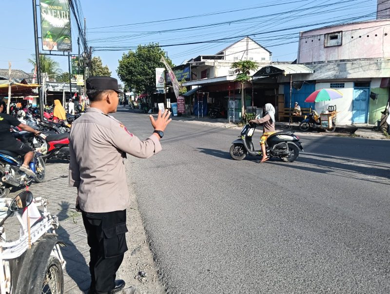 Anggota jaga polsek Kedungpring melaksanakan kegiatan commander wish, pengaturan lalu lintas antisipasi laka lantas di pertigaan pasar Desa Kedungpring.
