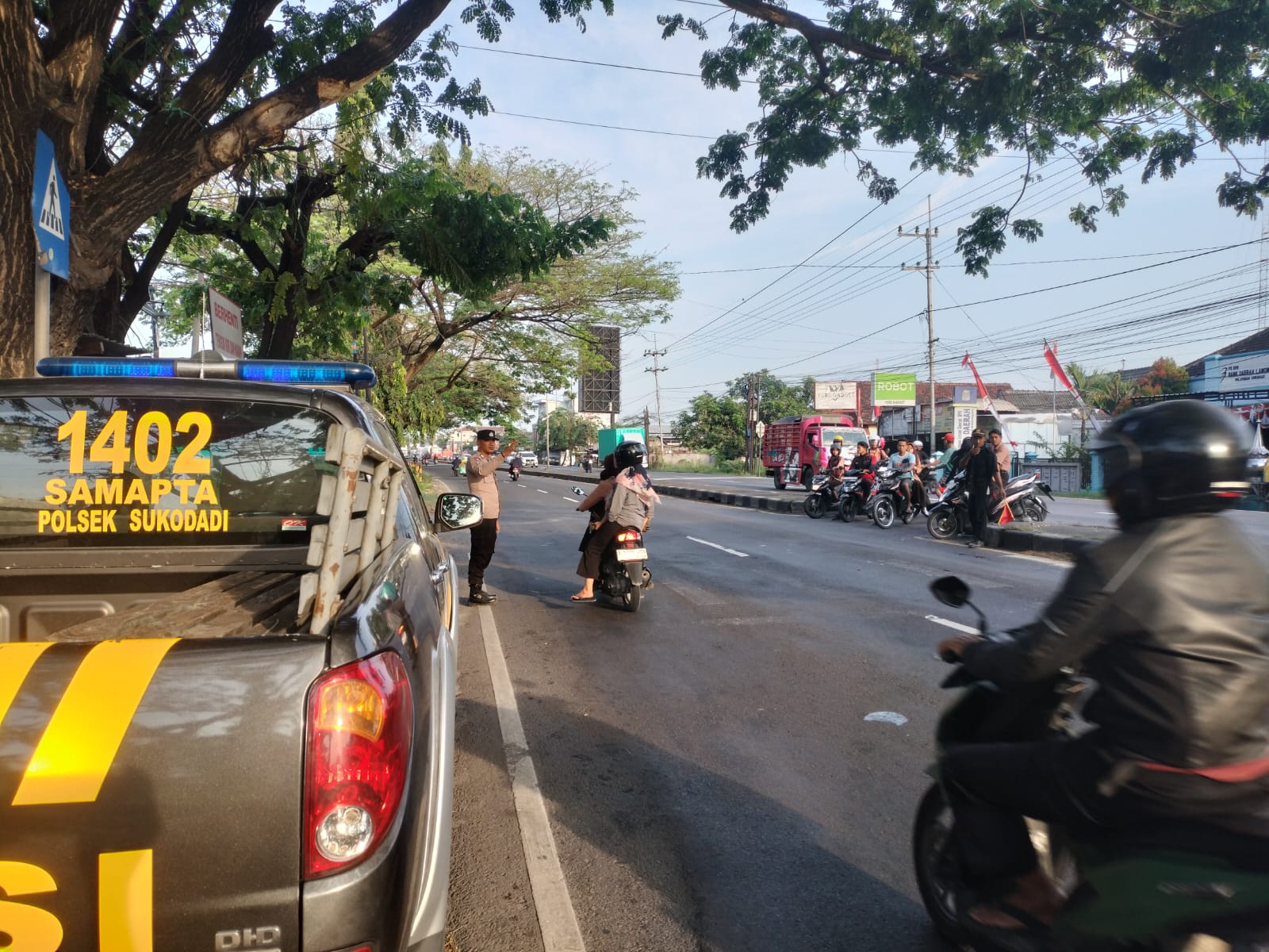 Polsek Sukodadi polres lamongan telah melaksanakan giat patroli pengaturan lalu lintas pagi untuk memberikan pelayanan terhadap masyarakat antara lain kegiatan penyebrangan masyarakat di jalan panglima sudirman desa Sukodadi kecamatan Sukodadi kabupaten lamongan, selasa 28 Oktober 2025 pukul 06:40 wib.