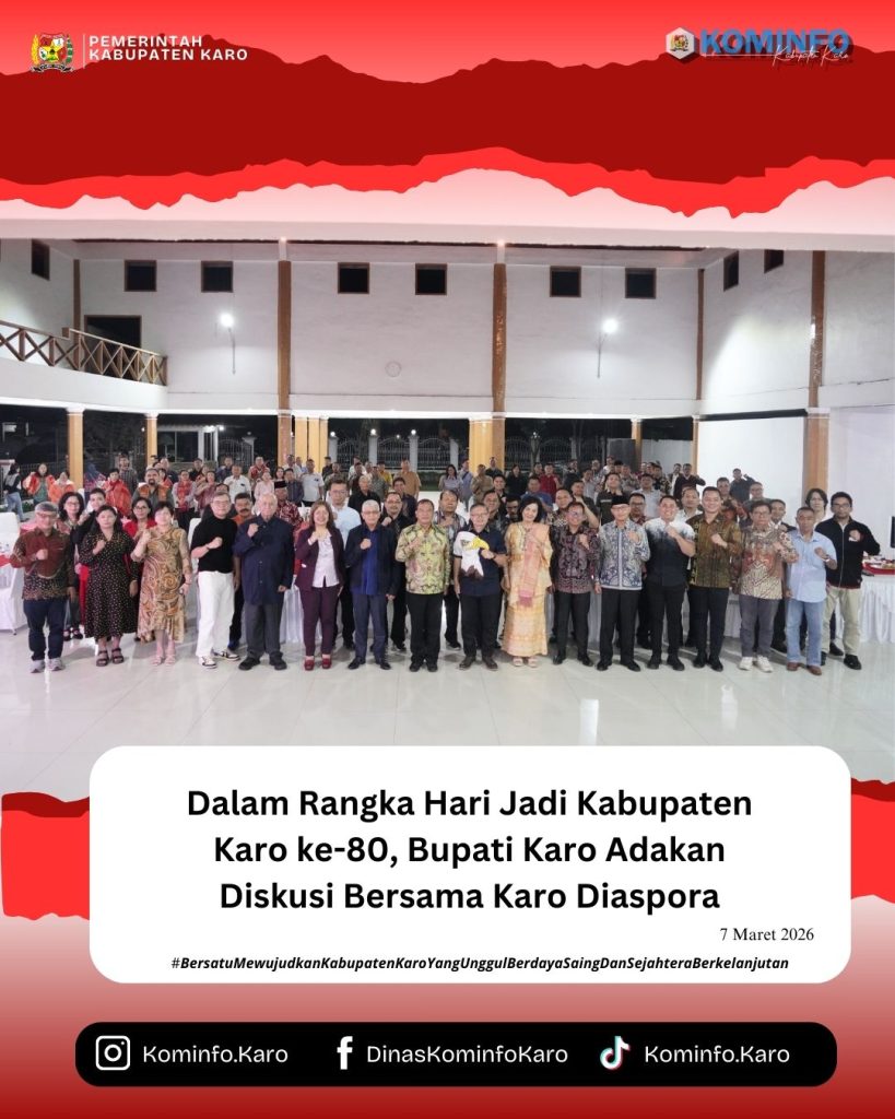 KARO – WARTAREALITAS – Menandai momentum bersejarah dalam rangkaian Hari Jadi Kabupaten Karo ke-80, Pemerintah Kabupaten Karo menggelar diskusi strategis bertajuk “Satu Visi Satu Langkah Kolaborasi Tokoh Karo dan Pemerintah dalam Membangun Kabupaten Karo”. Acara yang berlangsung di Jambur Pemkab Karo, Sabtu (7/3/2026), menjadi perdana dalam sejarah di mana Pemerintah Daerah secara khusus mengundang para tokoh diaspora untuk duduk bersama merumuskan masa depan daerah.