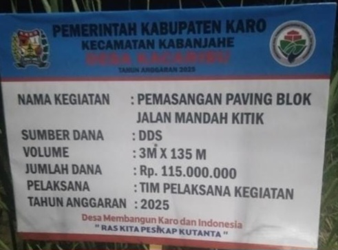 Kegiatan pemasangan paving block jalan mandah kitik Desa Kacaribu, Kec.Kabanjahe, Kab.Karo , dengan volume 3M x 135M, dana desa yang digelontorkan Pemdes Kacaribu tercatat Rp. 115.000.000,