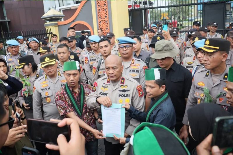 Pekanbaru – Wakapolda Riau memimpin langsung pengamanan aksi damai yang digelar oleh Badko Himpunan Mahasiswa Islam (HMI) Riau di Mapolda Riau. Kegiatan ini bertujuan untuk menyalurkan aspirasi mahasiswa terkait ketimpangan sosial dan maraknya kasus korupsi di negeri ini, Selasa (2/9/2025).